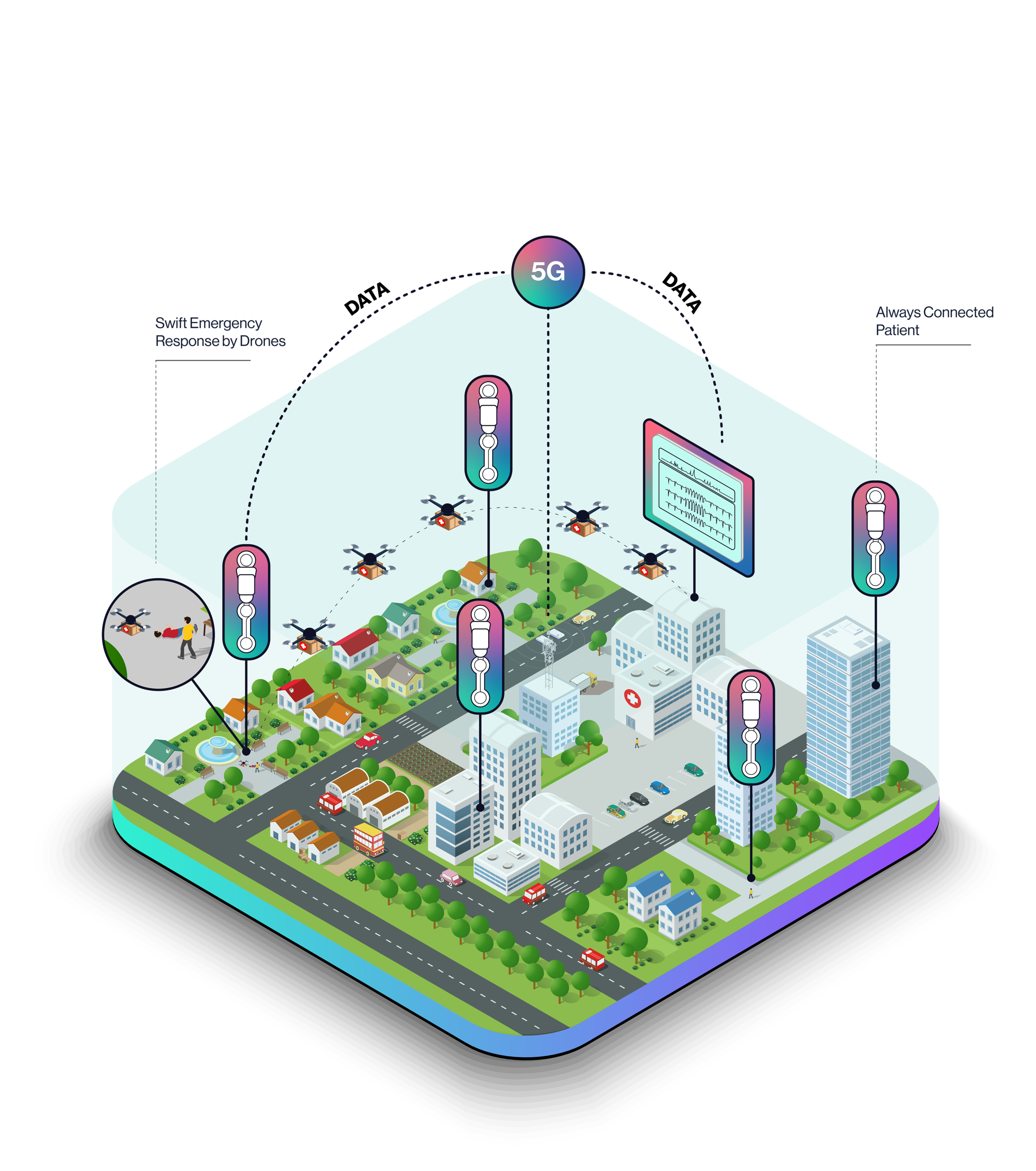 - Always connected patient: a 5G wearable hub acts as a mobile hub for medical data, allowing doctors to continuously monitor patients, regardless of their location.